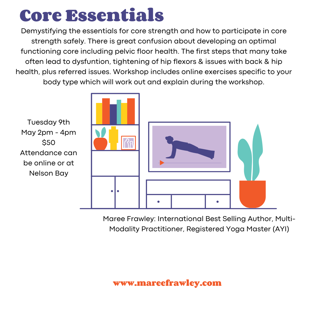 Core strength, stability and mobility are some of the most sought after muscle patterns for injury prevention, muscle balance and general strength and vitality. Over the years the exercises modify, but there are some fundamentals that are essential for the creation of core stability and strength. Maree taught Pilates in the late 90s early 2000s, wrote courses and programs, training instructors and clients with Fit Ball and advanced training techniques. Although you may know Maree in the role of Yogi, Personal Trainer, Coach, her knowledge of the core and back and abdominal health will have you well on your journey to vitality. Tuesday 9th May 2pm – 4pm. $50. To book online click here.