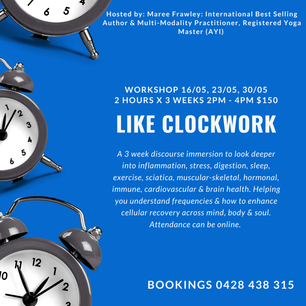 This 3 week discourse immersion will look deeper into inflammation, stress, digestion, sleep, exercise, sciatica, muscular-skeletal, hormonal, immune, cardiovascular and brain health. Helping you with understanding of the electrics, frequencies and how to enhance cellular recovery across mind, body & soul… so not much Tuesday 2pm-4pm. May 16th, 23rd, 30th $150. Attendance can be via Zoom, in the room or replay afterwards. Recordings available for all participants. To book click here.