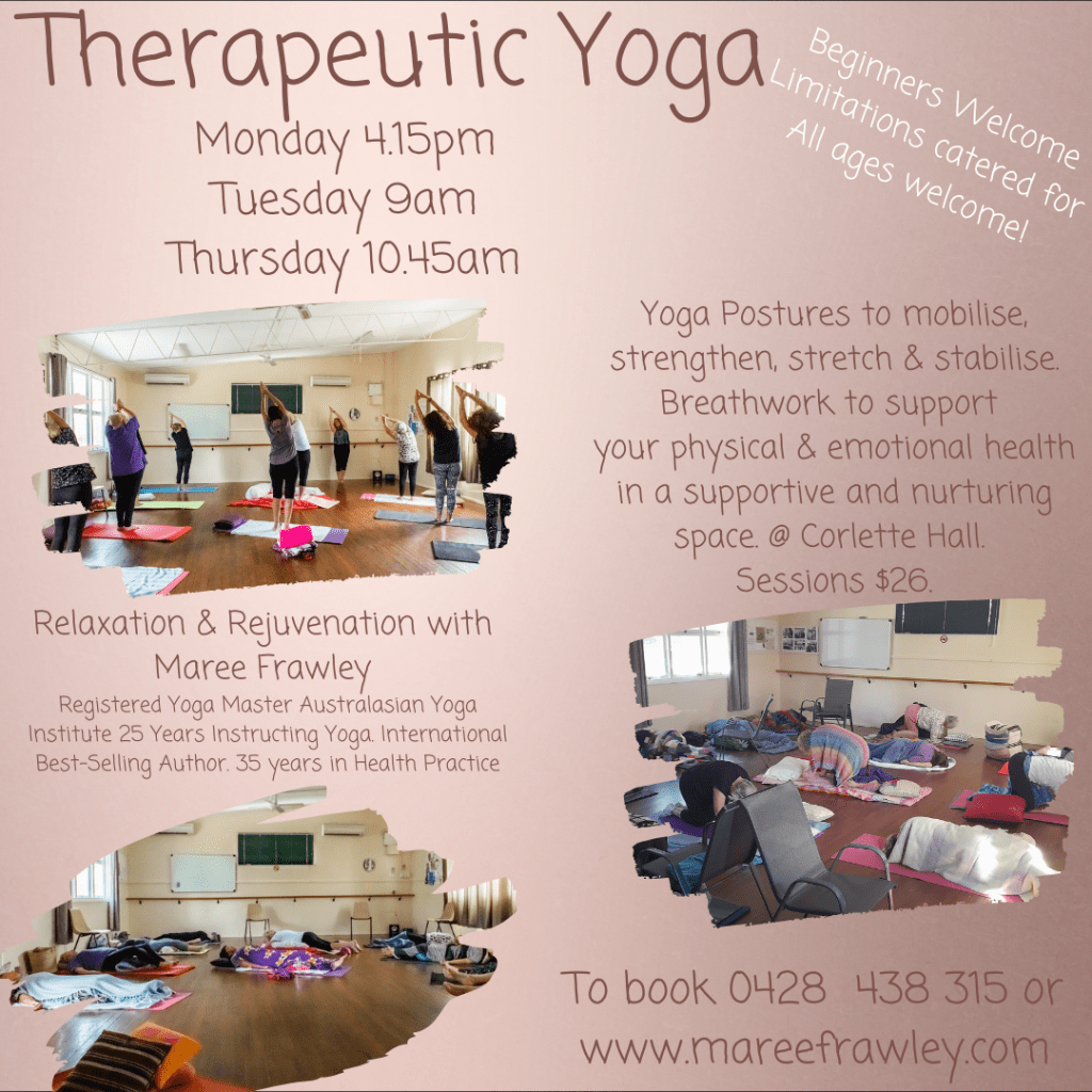Therapeutic Yoga with Maree is a gentle discovery about your health physically, emotionally and soulfully and your gentle journey of improvement. Postures and movements are focused to enhance your everyday life with mobility and flexibility (All limitations catered for). Your emotional health is supported with the beautiful community and learning techniques that assist to focus your thoughts, calm anxieties, lift depressions and focus on the light in everyday life. $26.50 or 5 sessions for $115. Bookings essential.